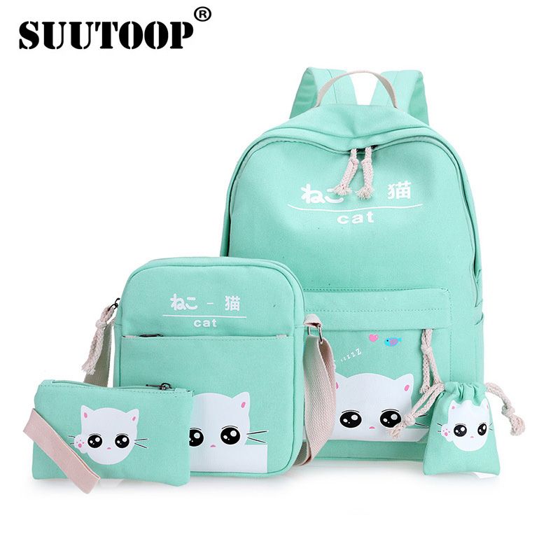 Girls Cat Backpack Set School Canvas Bag - Khaki
